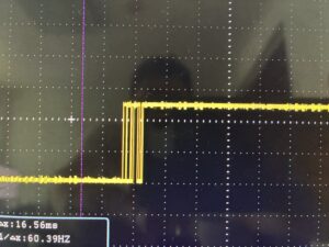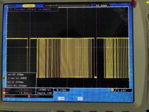 위의 표를 참고하여 버스트모드로 변조파형을 쏘아보았다. 38KHz 신호에서 41ms 구간보다 짧은 경우 다음과 같이 글리치가 발생하고 이보다 긴 경우 글리치가 사라지는 것을 확인하였다.