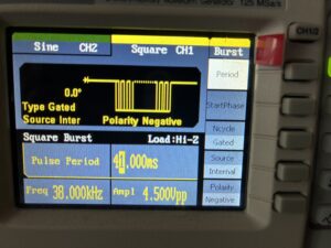 자 다음 단계이다. 송신부에 펑션제네레이터로 38KHz로 변조한 신호만들어서 송신해보았다. 그런데 수신신호부가 명확하게 관잘되지 않았다. 사용한 센서는 데이터 송신용이기 떄문에 최대 받아들일 수 있는 파형의 갯수는 제안되어있다. 따라서 연속 신호를 전송할 경우 불규칙한 수신신호가 잡히게 된다. 연속파형도 억제되어 어느정도 송신후 멈춰주어야하였다.