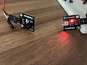 적외선 발광소자는 눈에 보이지 않기 때문에 모듈에는 붉은색 LED로 빛이 나서 동작중임을 알 수 있게 한다. 수신측에서도 수신할 경우 LED로 확인할 수 있도록 되어있다. 그런데 전원을 켜도 수신측에 신호가 검출되지 않았다.