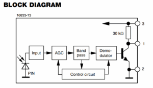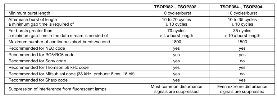 이것을 보니 사용한 수신모듈이 포토트랜지스터가 아니라 데이터 수신용 회로가 포함된 것으로 추정할 수 있다. 자료를 더 찾아보았다. 이런 모듈들의 원조급되는 제품들은 adafruit 에서 만든다. 2] 생긴게 상당히 유사하고 여기에서 사용하는 수신 소자는 TSOP38238 이고 Vishey제품이어서 데이터시트를 검토해보았다. 3]