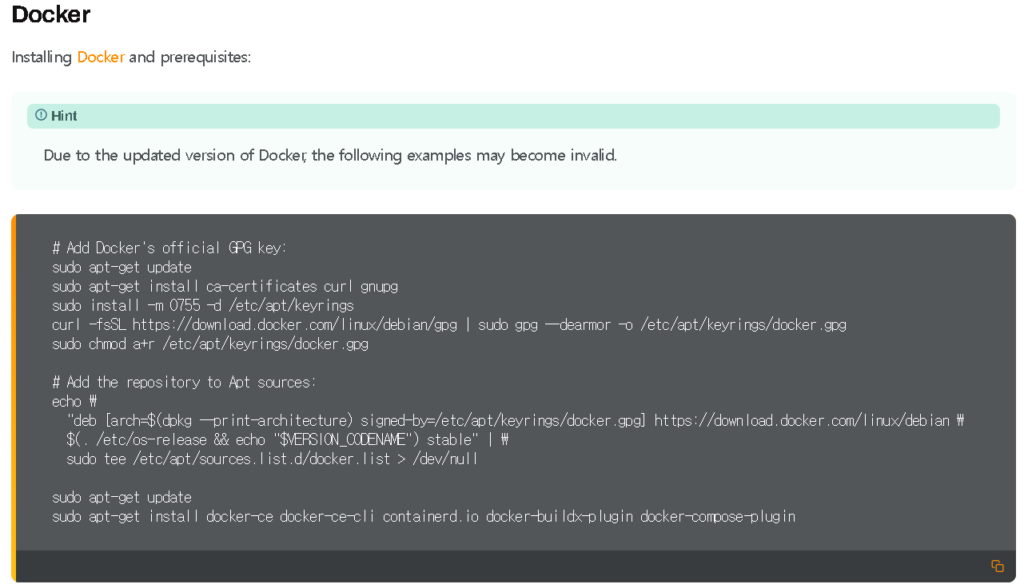 새로 설치한 OS라면 도커를 설치한다. 이미 도커를 운영하고 있다면 아래 단계대로 빌드용 docker를 설치한다.